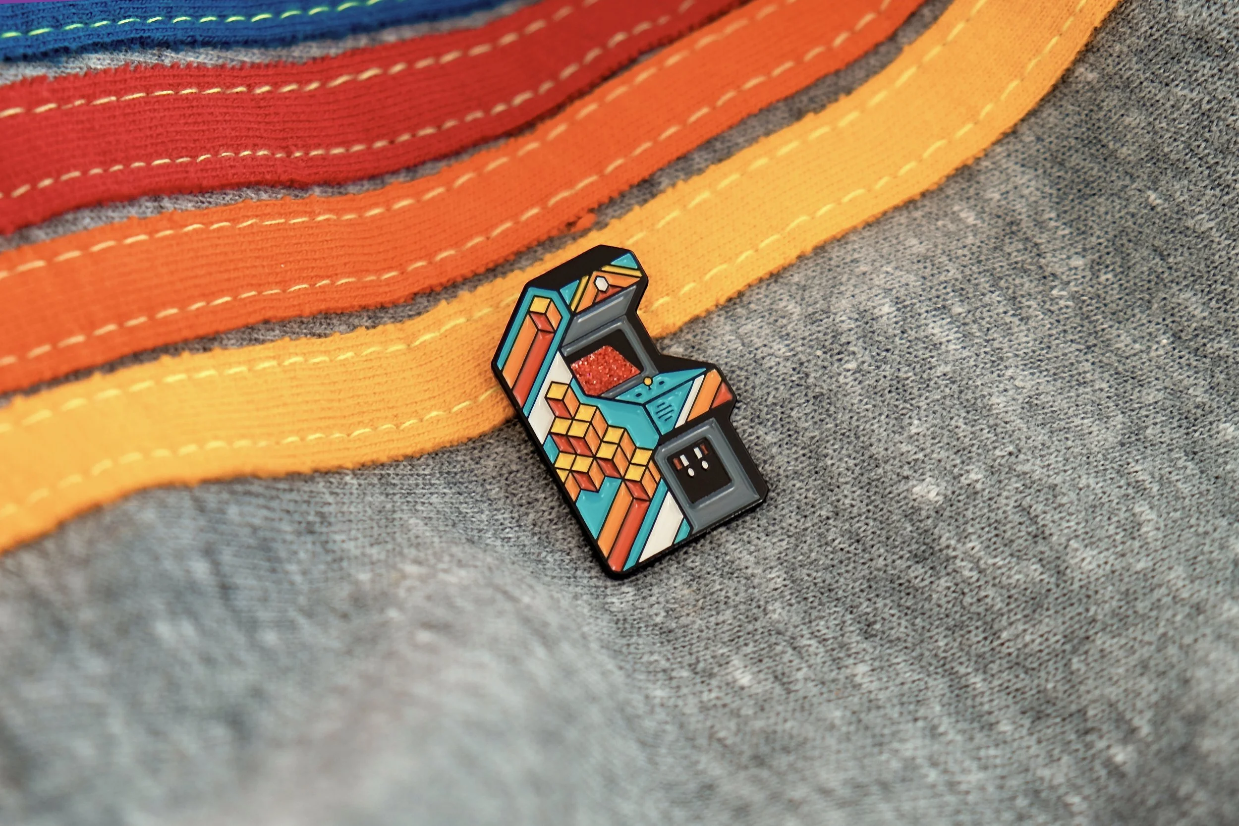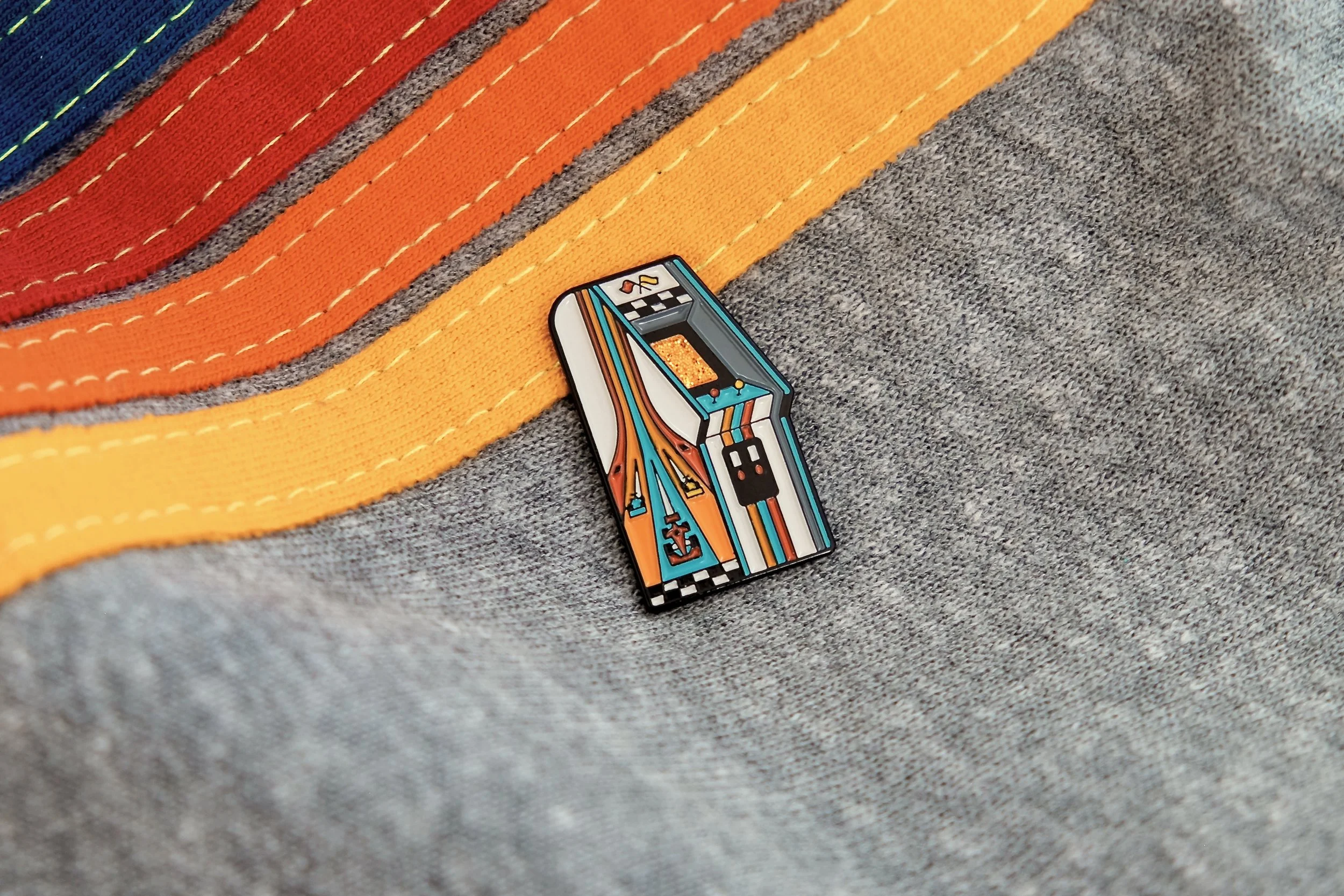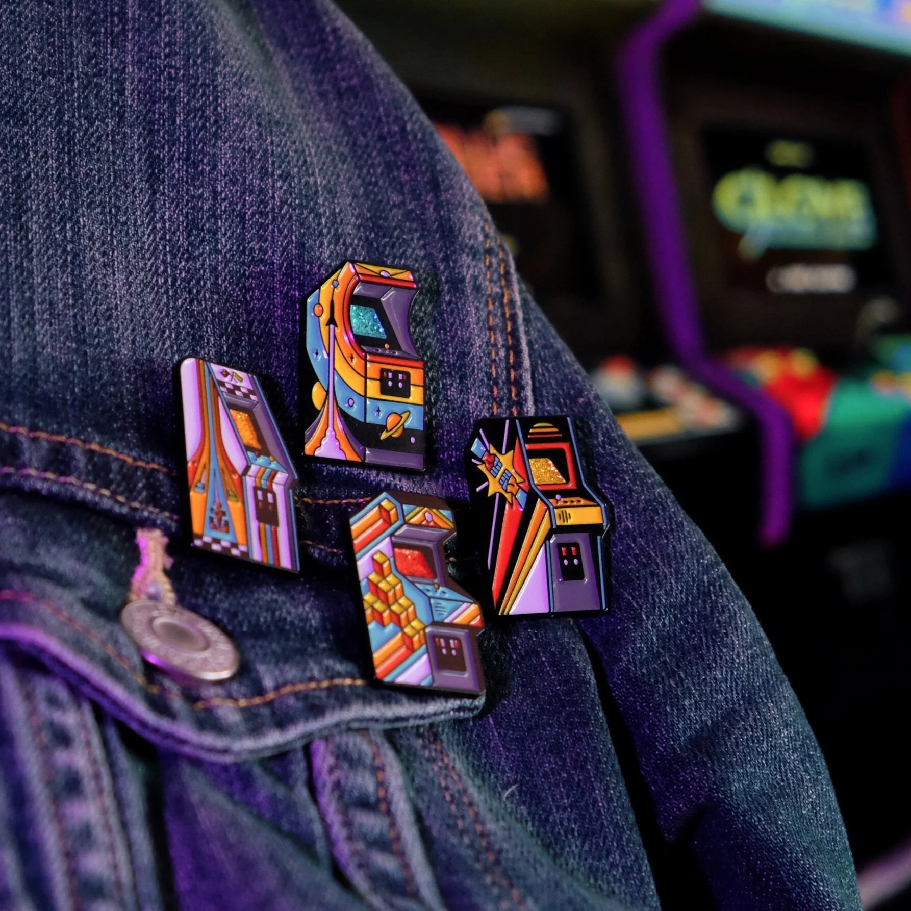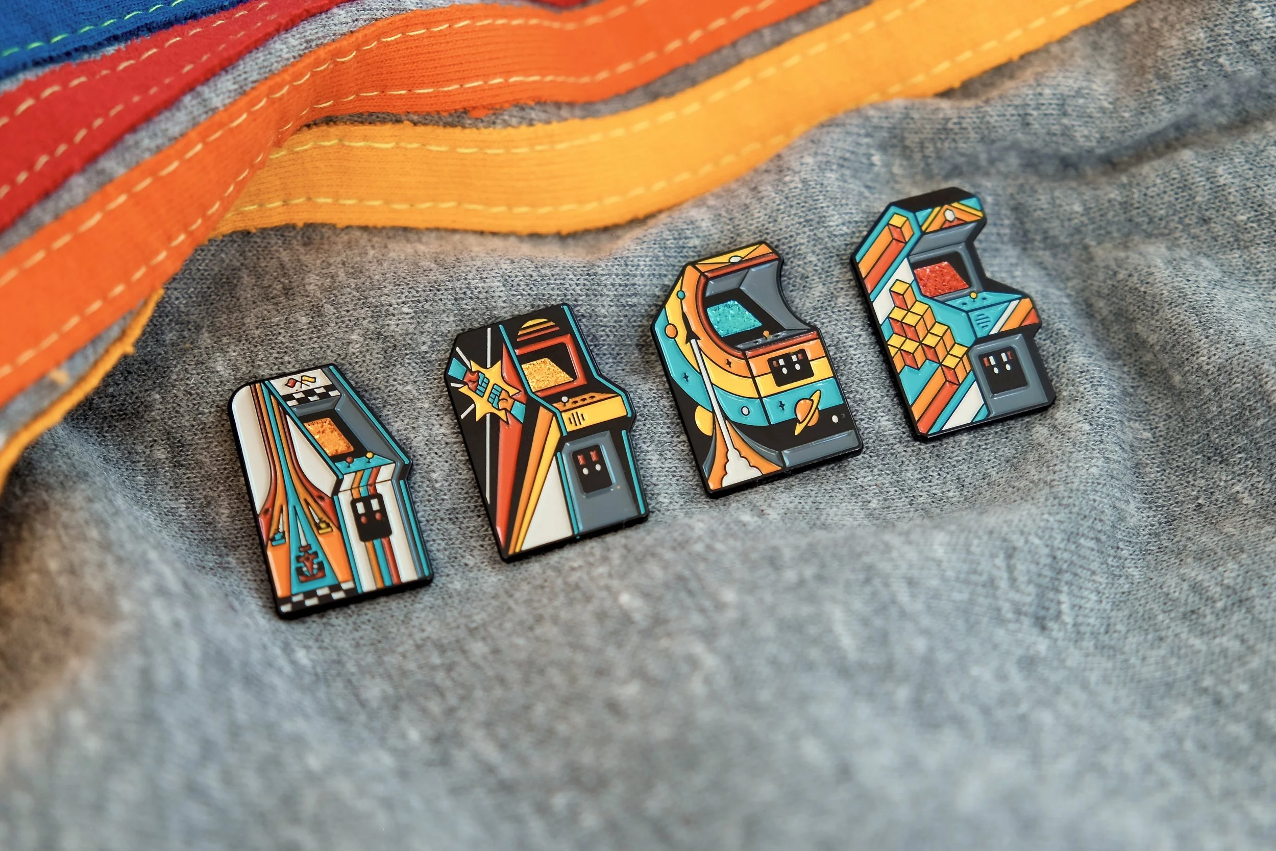As children of the 80s we’re big fans of classic arcade games and childhood memories of spending after school afternoons at the local coin-op arcade. So we decided to create our own take on some of our favorite genres of stand-up cabinet games, in the form of enamel pins. Fly, Fight, Build, and Race are all 1” soft enamel pins with black metal finish, heavy duty rubber backing clasps, the extra touch of glitter fills on each cabinet screen. Each Arcade pin is available in the DKNG store for $10 and the pin pack including all four consoles is on sale for just $30.