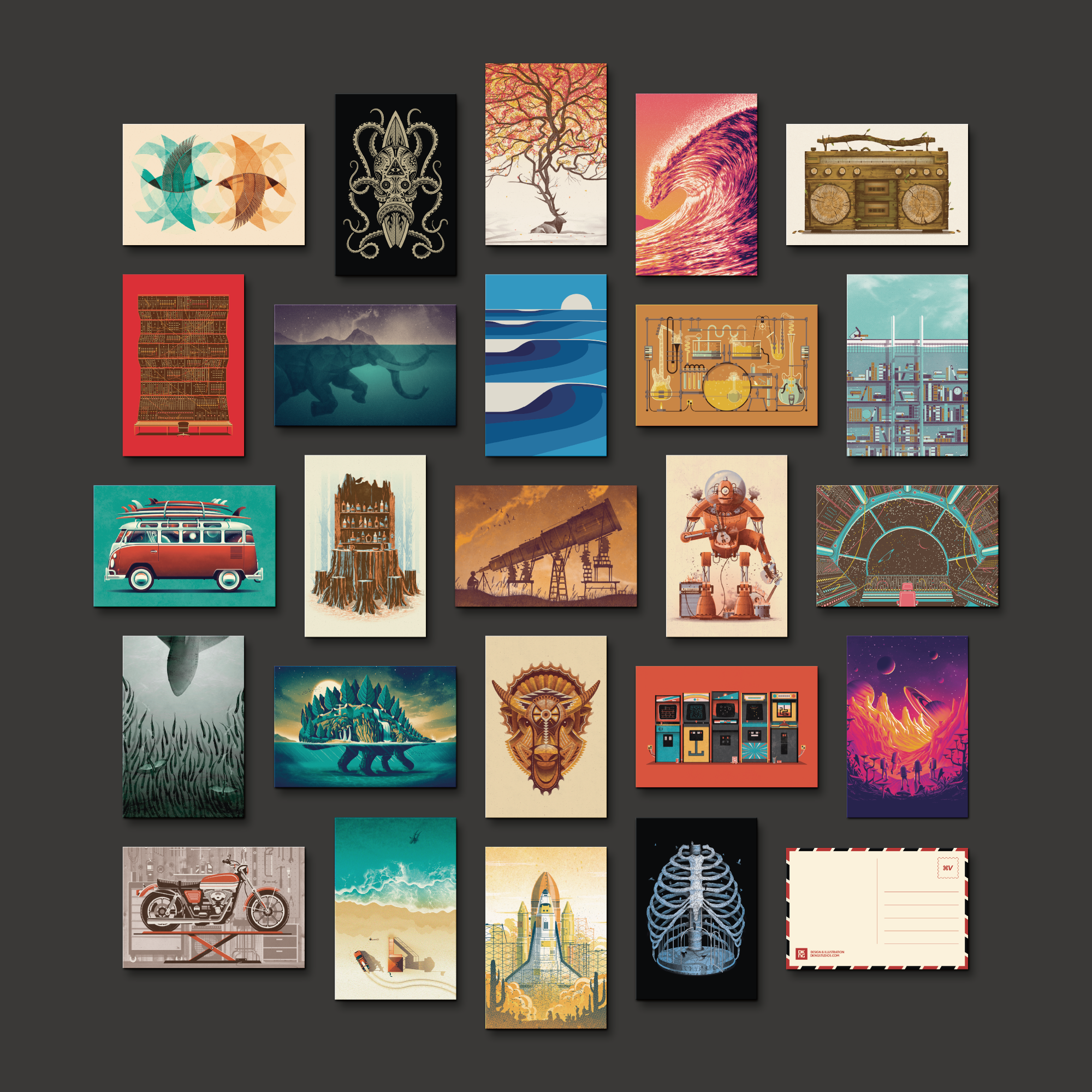 Our new and improved DKNG postcards are in stock and ready to stuff stockings. Whether you're sending holiday correspondence to the north pole, or putting together a mini gallery wall, our 4" x 6" postcards now feature thicker 19pt card stock, a velvety smooth finish, and an uncoated back for easier writability. Right now you can grab the full set of 24 different postcards for just $15, and they're now shipping in time for the holidays.