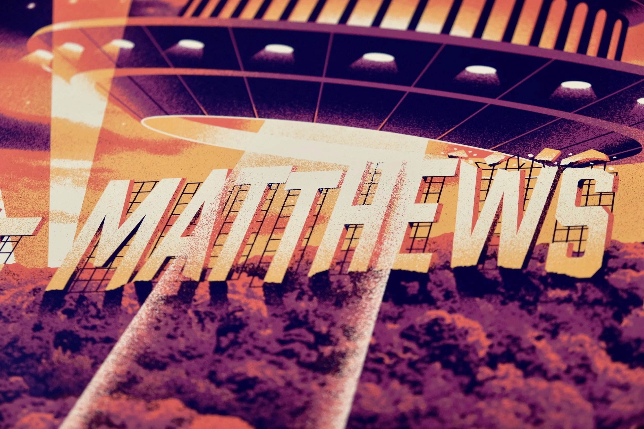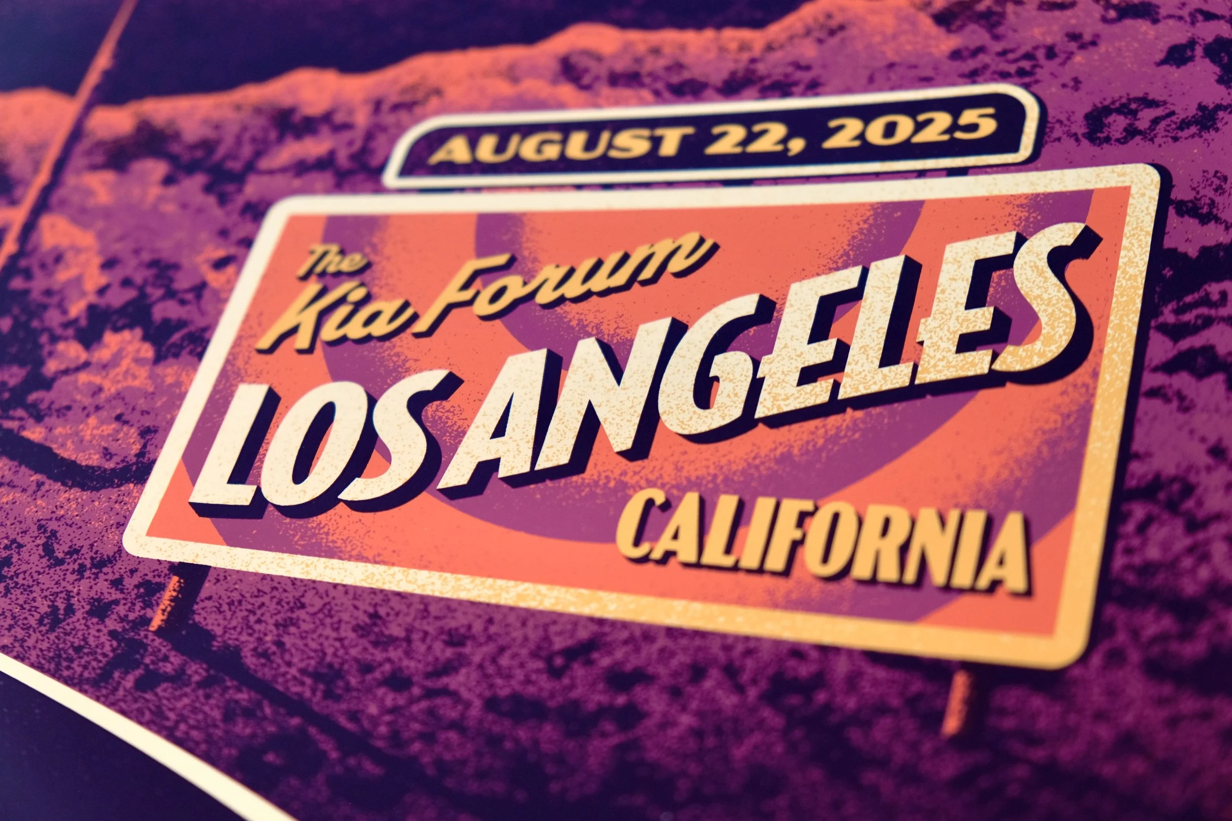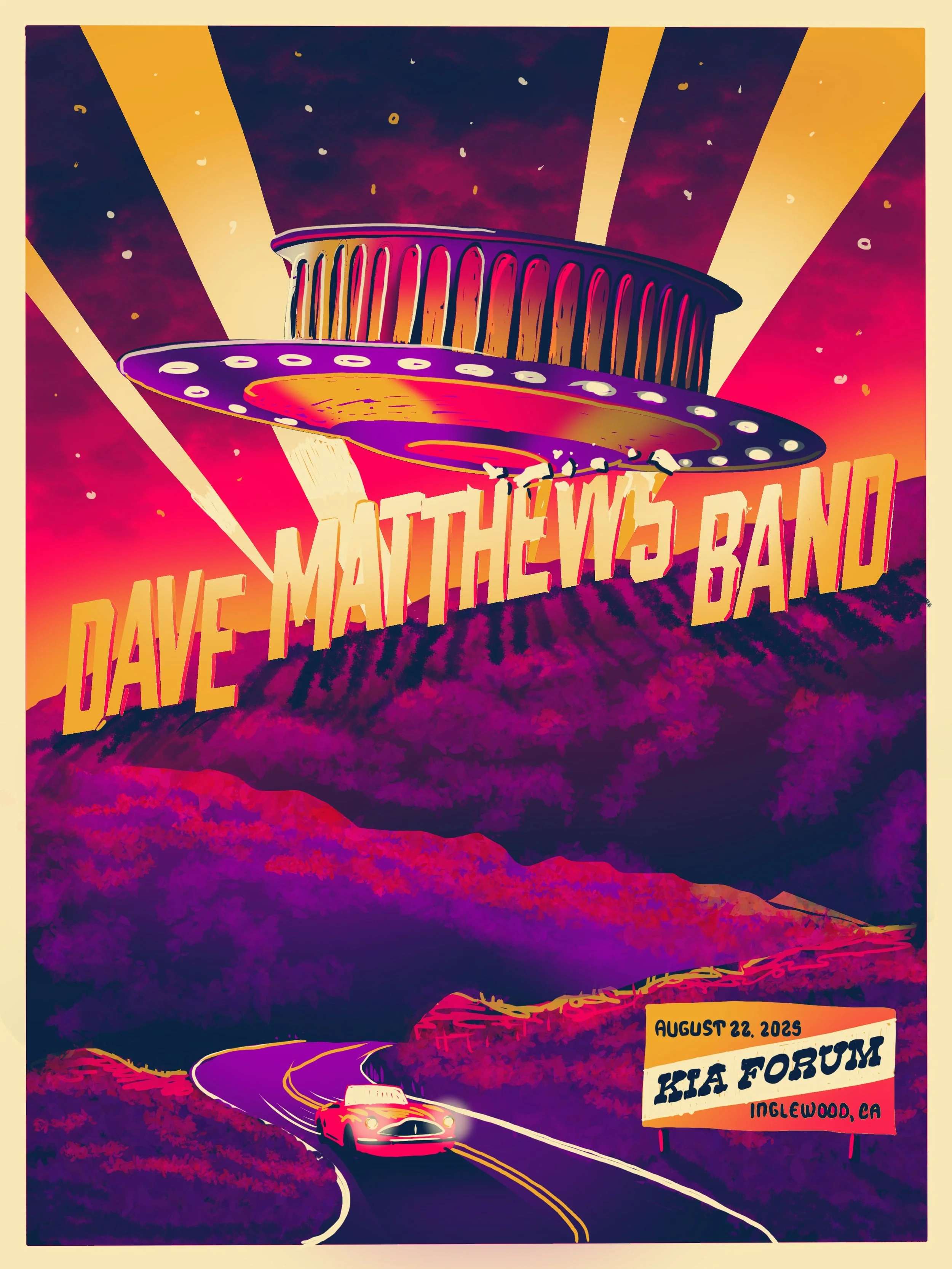 The band played the famed Kia Forum in Inglewood, so we had a blast putting a local LA spin on the art. Inspired by fantastical scenes from LA-based films, we set the scene in the Hollywood hills with a UFO breaking through a hillside sign. The UFO flies above a vintage convertible, beaming up a couple who couldn't have imagined that this is where their evening would go.