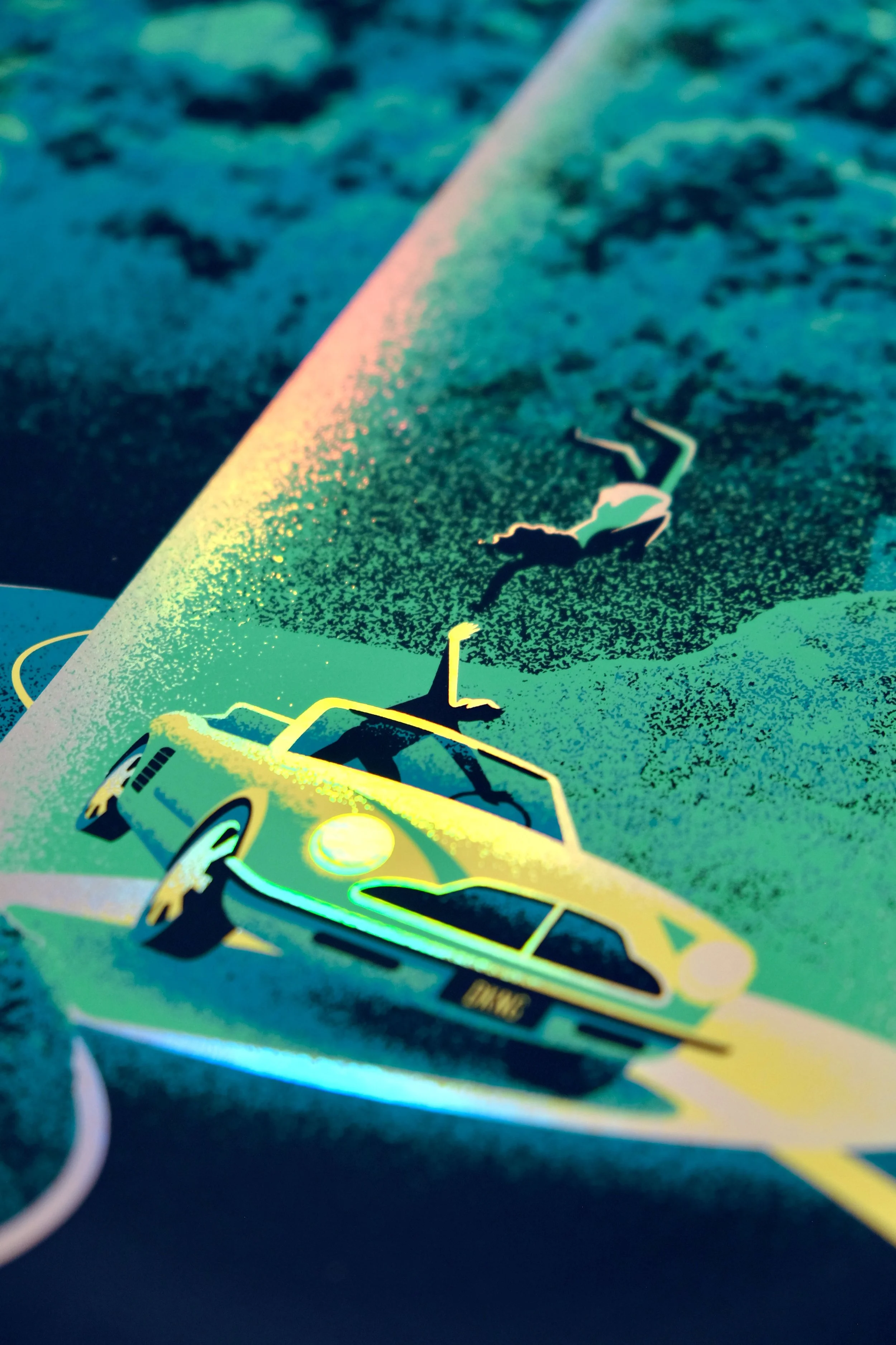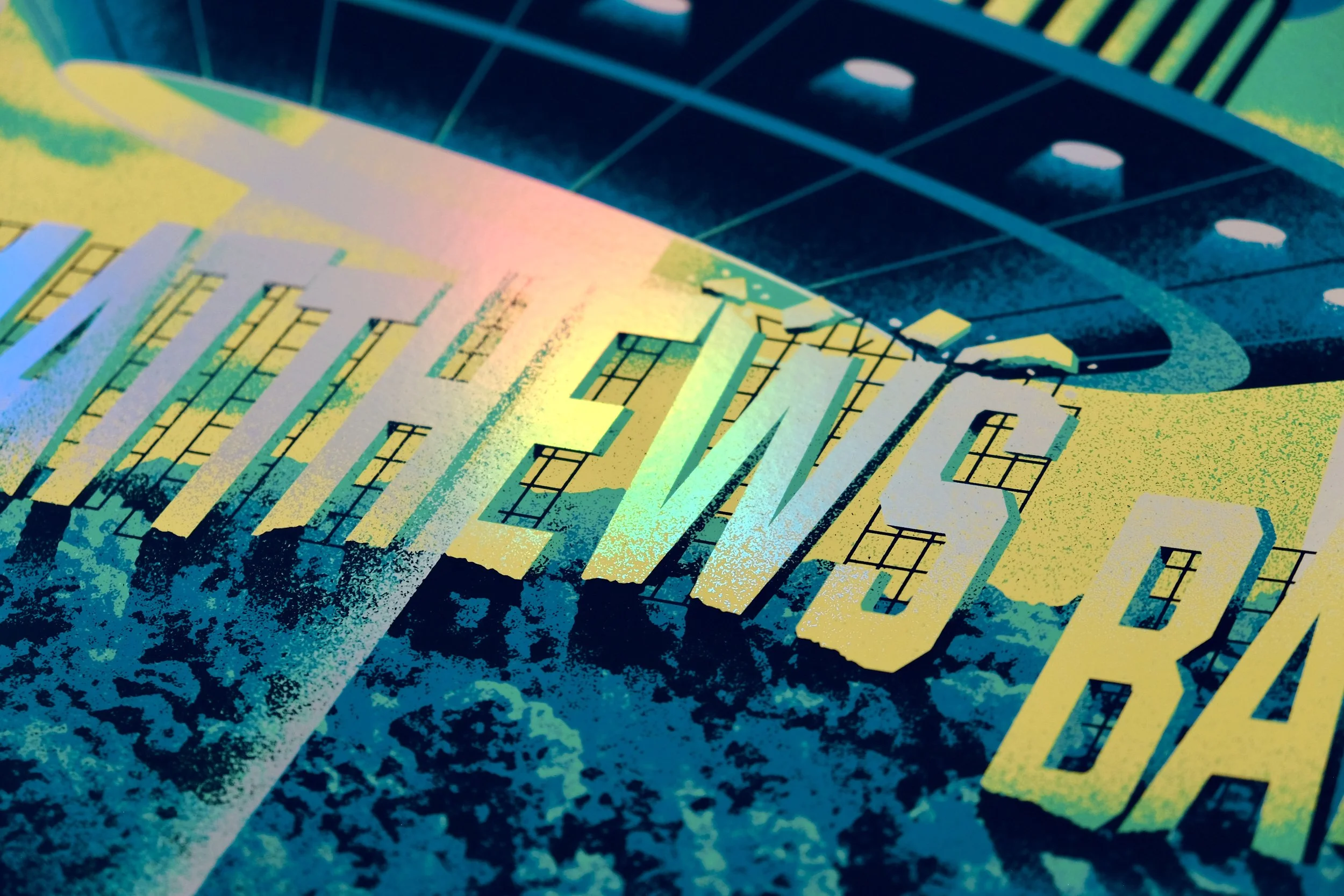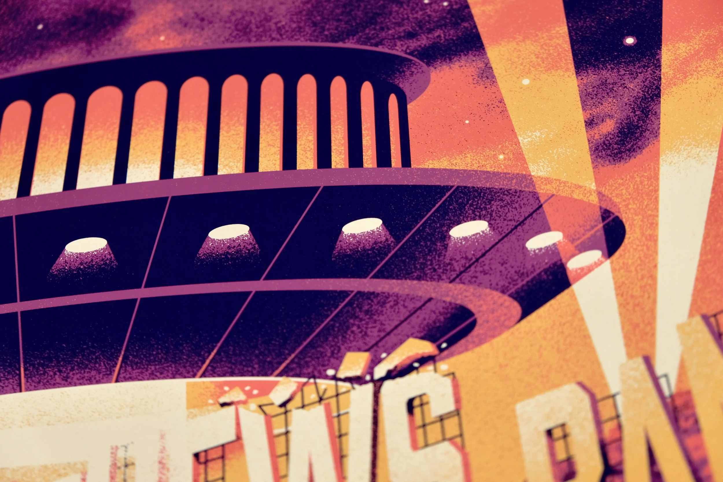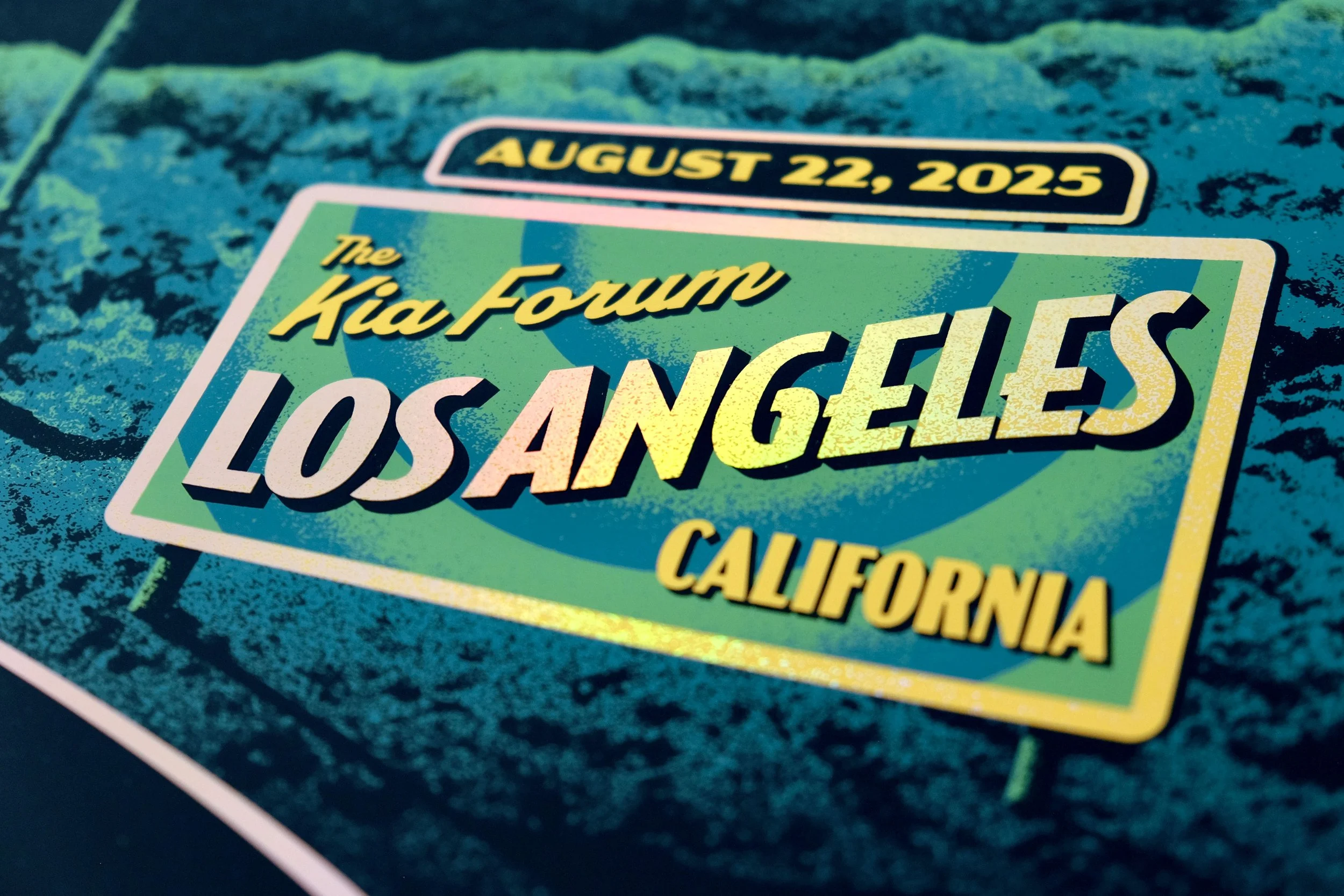 The band played the famed Kia Forum in Inglewood, so we had a blast putting a local LA spin on the art. Inspired by fantastical scenes from LA-based films, we set the scene in the Hollywood hills with a UFO breaking through a hillside sign. The UFO flies above a vintage convertible, beaming up a couple who couldn't have imagined that this is where their evening would go.